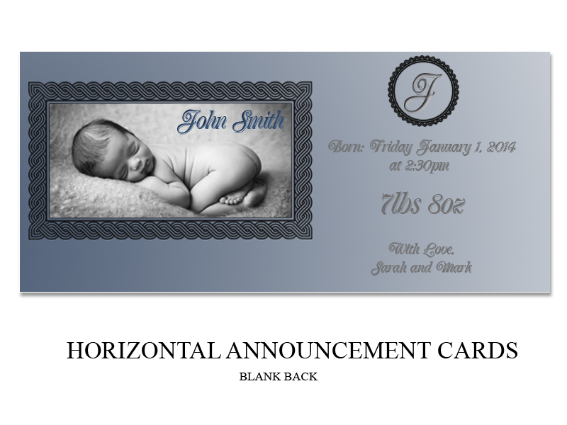 Perfect for sending friends, family and guests a special annoucement. All of our cards are custom designed with your image selections. We will email you a proof for approval and then print, in-studio, in quantities starting at 50. Also available in vertical orientation.
